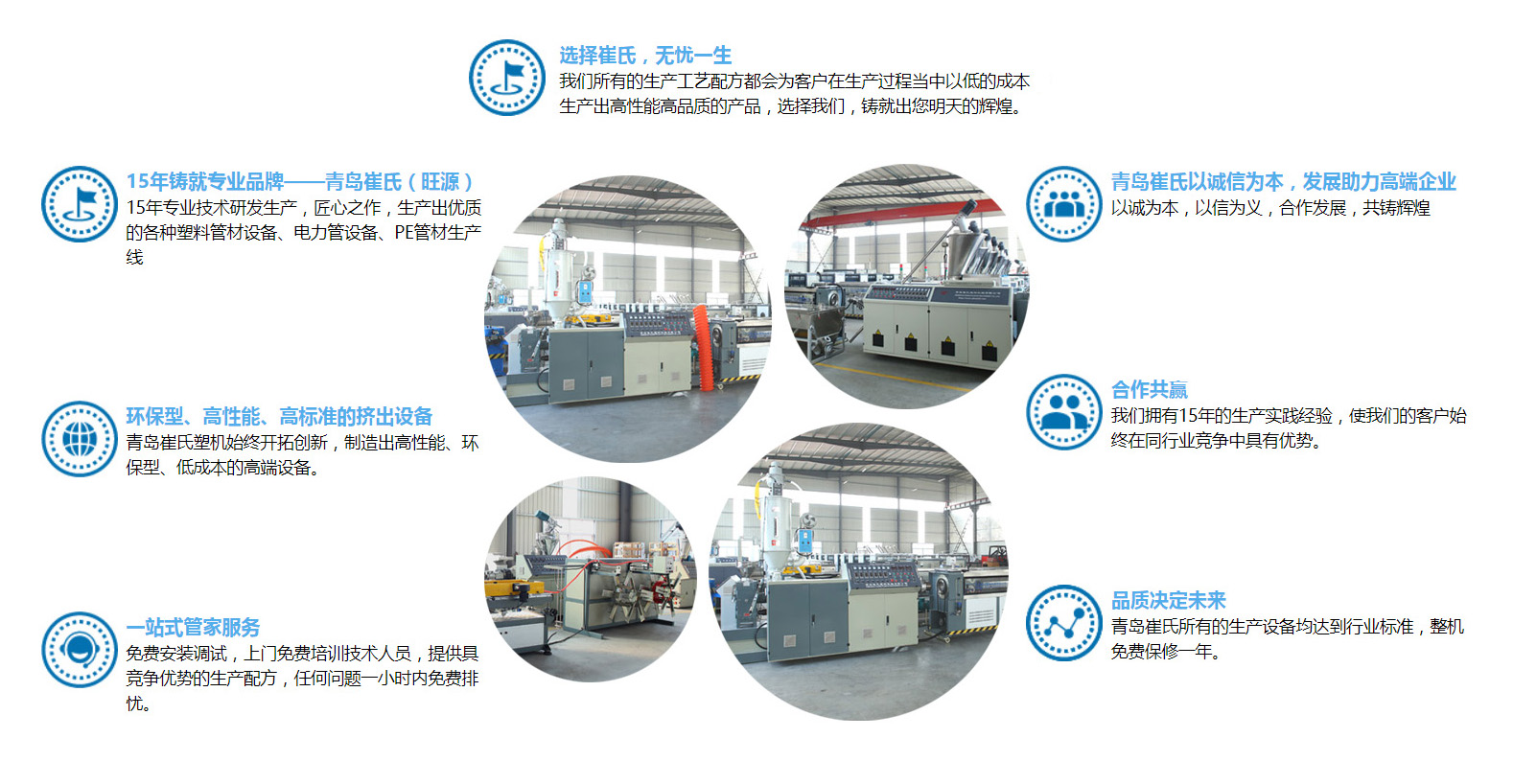 青島崔氏塑料機械:生產(chǎn)的預應力塑料波紋管設(shè)備、電力管設(shè)備、塑料波紋管設(shè)備、汽車線束波紋管設(shè)備、PPR、PE、PVC、PERT管材設(shè)備及其它各種管材設(shè)備、塑料型材設(shè)備、塑料蜂窩板設(shè)備, 遠銷:歐州,獨聯(lián)體,南美洲,中東,東南亞,大洋州,非洲等地的20多個國家和地區(qū)。
